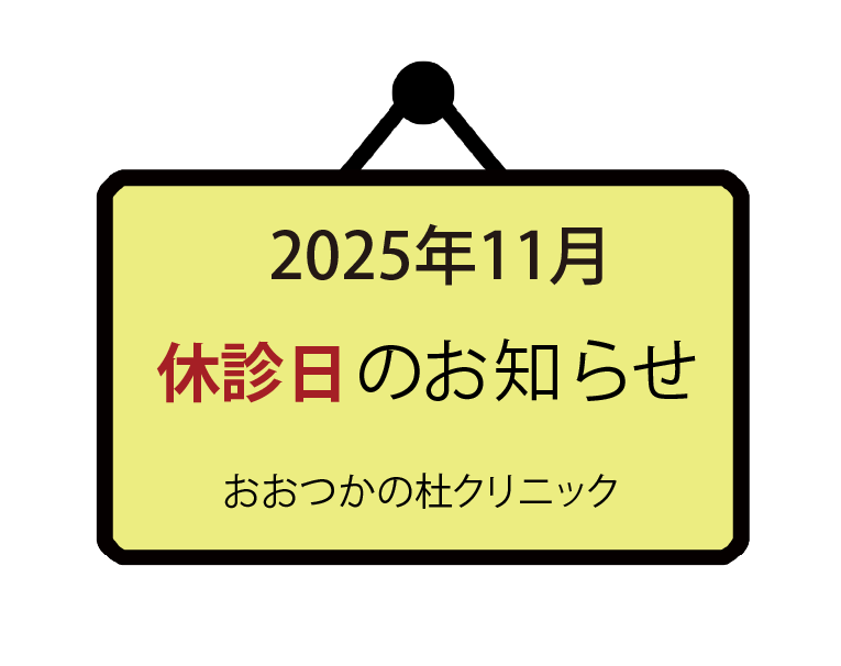 おおつかの杜クリニック休診日のお知らせ 2025.10.27 お知らせ 休診日のお知らせ 11月18日(火) 皆様にはご不便をおかけいたしますが、ご理解のほどお願いいたします。 おおつかの杜クリニック 院長